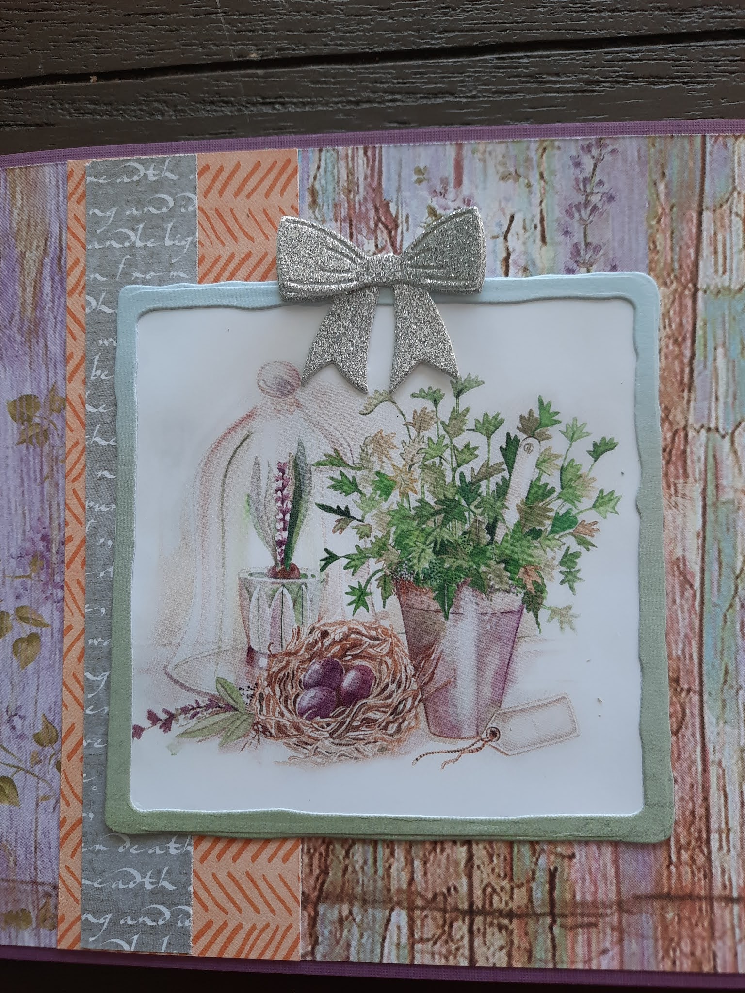 Dit keer combineerde ik de mooie cardtoppers met restjes van MD en grote stukken designpapier van de Action (achter de mus) en van Stamperia Provence (achter de plantjes).